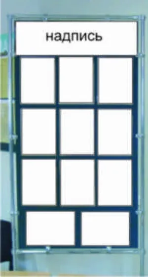 • Напольный информационный стенд на ножках содержит 11 карманов формата А 4 и надпись в верхней части. Основа стенда ДСП 16 мм 1400х820 мм. Собран при помощи системы TRIS 25 мм.