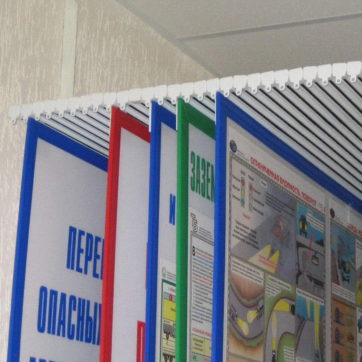 Шторная система предназначена для компактного размещения большого количества стендов по охране труда, пожарной безопасности, гражданской обороне и т.д.